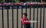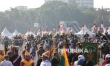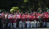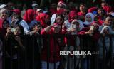 Warga menyaksikan prosesi kirab Bendera Pusaka Merah Putih dan Teks Proklamasi menggunakan Kereta Kencana Garuda Prabayaksa untuk dikirab dari Monas menuju Istana Merdeka di Jakarta, Ahad (17/8/2025). Parade Kirab yang membawa Bendera Pusaka Merah Putih dan Teks Proklamasi tersebut menjadi salah satu rangkaian dalam upacara peringatan Hari Kemerdekaan ke-80 Republik Indonesia di Istana Merdeka. Sejumlah warga tampak memadati area Monumen Nasional untuk menyaksikan prosesi kirab tersebut. Pada Hari Kemerdekaan ke-80 Republik Indonesia ini mengusung tema Bersatu Berdaulat, Rakyat Sejahtera Indonesia Maju. (FOTO : Republika/Thoudy Badai)