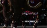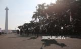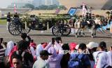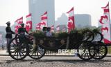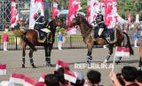 Pasukan Berkuda mengiringi Kereta Kencana Garuda Prabayaksa yang membawa Bendera Pusaka Merah Putih dan Teks Proklamasi untuk dikirab dari Monas menuju Istana Merdeka di Jakarta, Ahad (17/8/2025). Parade Kirab yang membawa Bendera Pusaka Merah Putih dan Teks Proklamasi tersebut menjadi salah satu rangkaian dalam upacara peringatan Hari Kemerdekaan ke-80 Republik Indonesia di Istana Merdeka. Sejumlah warga tampak memadati area Monumen Nasional untuk menyaksikan prosesi kirab tersebut. Pada Hari Kemerdekaan ke-80 Republik Indonesia ini mengusung tema Bersatu Berdaulat, Rakyat Sejahtera Indonesia Maju. (FOTO : Republika/Thoudy Badai)