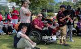 Warga negara asing menyaksikan pertunjukan udara pesawat tempur TNI AU saat peringatan Hari Kemerdekaan ke-80 Republik Indonesia di Jakarta, Ahad (17/8/2025). Pertunjukan udara tersebut menampilkan atraksi dari pesawat The Jupiters atau Jupiter Aerobic Team (JAT) TNI AU bersama pesawat tempur lainnya seperti F-16 Fighting Falcon, T-50i Golden Eagle hingga Hawk. (FOTO : Republika/Thoudy Badai)