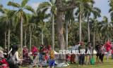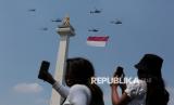 Warga menyaksikan pertunjukan udara pesawat tempur TNI AU saat peringatan Hari Kemerdekaan ke-80 Republik Indonesia di Jakarta, Ahad (17/8/2025). (FOTO : Republika/Thoudy Badai)