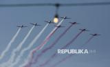 Atraksi pesawat tempur milik TNI AU saat melakukan manuver pada peringatan Hari Kemerdekaan ke-80 Republik Indonesia di Jakarta, Ahad (17/8/2025). Pertunjukan udara tersebut menampilkan atraksi dari pesawat The Jupiters atau Jupiter Aerobic Team (JAT) TNI AU bersama pesawat tempur lainnya seperti F-16 Fighting Falcon, T-50i Golden Eagle hingga Hawk. Pesawat tempur jenis F-16 membentuk formasi angka 80 serta sejumlah helikopter membentangkan bendera Merah Putih di langit Jakarta. (FOTO : Republika/Thoudy Badai)
