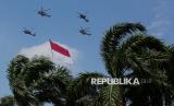 Atraksi helikopter TNI Polri membawa bendera merah putih pada peringatan Hari Kemerdekaan ke-80 Republik Indonesia di Jakarta, Ahad (17/8/2025). (FOTO : Republika/Thoudy Badai)