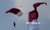 Prajurit TNI melakukan aksi terjung payung pada peringatan Hari Kemerdekaan ke-80 Republik Indonesia di Jakarta, Ahad (17/8/2025). (FOTO : Republika/Thoudy Badai)