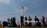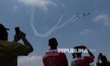 Warga menyaksikan pertunjukan udara pesawat tempur TNI AU saat peringatan Hari Kemerdekaan ke-80 Republik Indonesia di Jakarta, Ahad (17/8/2025). Pertunjukan udara tersebut menampilkan atraksi dari pesawat The Jupiters atau Jupiter Aerobic Team (JAT) TNI AU bersama pesawat tempur lainnya seperti F-16 Fighting Falcon, T-50i Golden Eagle hingga Hawk. (FOTO : Republika/Thoudy Badai)