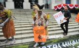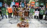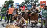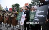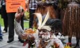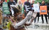 Koalisi organisasi masyarakat sipil dan sejumlah orang yang tergabung dalam gerakan Rakyat menggugat PSN (Geram PSN) melakukan ritual adat berdoa bersama sebelum sidang judicial review di Mahkamah Konstitusi, Jakarta, Selasa (19/8/2025). (FOTO : Republika/Prayogi)