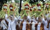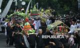 Peserta karnaval membawa bermacam buah-buahan saat kirab budaya atau karnaval Jabar Hudang dalam rangka perayaan HUT Provinsi Jawa Barat (Jabar) ke-80, di Kota Bandung, Selasa (19/8). Karnaval yang diikuti seluruh kota dan kabupaten di Jabar ini mengangkat spirit kebangkitan hasil pertanian, industri dan UMKM lokal. (FOTO : Edi Yusuf)