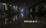 Banjir rob setinggi sekitar 20-50 centimeter menggenangi permukiman saat permukaan air laut naik setiap sekitar pukul 17.00 WIB dan kembali surut diatas pukul 00.00 WIB. (FOTO : Republika/Thoudy Badai)