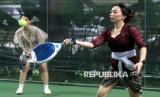 REPUBLIKA.CO.ID, MALANG -- Penggemar olahraga padel berbusana kebaya saat bertanding dalam Turnamen Padel Berwastra di Malang, Jawa Timur, Selasa (19/8/2025).