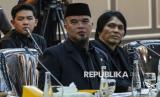 Anggota DPR sekaligus musisi Ahmad Dhani (tengah) bersama Anggota DPR sekaligus penyanyi Once Mekel (kanan) mengikuti Rapat Dengar Pendapat Umum (RDPU) Wakil Ketua DPR Sufmi Dasco Ahmad dan Komisi XIII DPR dengan Kementerian Hukum, Lembaga Manajemen Kolektif Nasional, Vibrasi Suara Indonesia (VISI), Asosiasi Komposer Seluruh Indonesia (AKSI), Wahana Musik Indonesia (WAMI) di Kompleks Parlemen, Senayan, Jakarta, Kamis (21/8/2025). Rapat tersebut membahas manajemen Royalti dan permasalahan dalam perlindungan karya cipta dan hak cipta. (FOTO : ANTARA FOTO/Asprilla Dwi Adha)