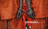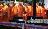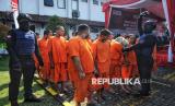 Para tersangka dihadirkan dalam acara pemusnahan barang bukti narkotika dan pengungkapan kasus rokok elektrik (vape) mengandung narkoba di halaman Kantor BNN, Jakarta, Jumat (22/8/2025). Badan Narkotika Nasional (BNN) memusnahkan 474 kilogram narkoba, terdiri atas 253.067 gram sabu, 218.414 gram ganja, 2.998 gram kokain, serta 94 butir ekstasi. Barang bukti tersebut merupakan hasil pengungkapan 21 kasus narkoba sepanjang Juni hingga Juli 2025. Dari pengungkapan kasus tersebut, BNN menangkap 43 tersangka di lima wilayah: Aceh, Sumatera Utara, Sumatera Barat, DKI Jakarta, dan Bali. (FOTO : Republika/Prayogi)