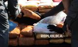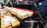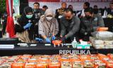 Sejumlah barang bukti narkotika ditunjukkan sebelum dimusnahkan dalam acara pemusnahan barang bukti narkotika dan pengungkapan kasus rokok elektrik (vape) mengandung narkoba di halaman Kantor BNN, Jakarta, Jumat (22/8/2025). Badan Narkotika Nasional (BNN) memusnahkan 474 kilogram narkoba, terdiri atas 253.067 gram sabu, 218.414 gram ganja, 2.998 gram kokain, serta 94 butir ekstasi. Barang bukti tersebut merupakan hasil pengungkapan 21 kasus narkoba sepanjang Juni hingga Juli 2025. Dari pengungkapan kasus tersebut, BNN menangkap 43 tersangka di lima wilayah: Aceh, Sumatera Utara, Sumatera Barat, DKI Jakarta, dan Bali. (FOTO : Republika/Prayogi)