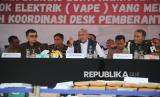 Kepala Badan Narkotika Nasional (BNN) Komjen Pol Marthinus Hukom (tengah) menyampaikan paparan dalam acara pemusnahan barang bukti narkotika dan pengungkapan kasus rokok elektrik (vape) mengandung narkoba di halaman Kantor BNN, Jakarta, Jumat (22/8/2025). Badan Narkotika Nasional (BNN) memusnahkan 474 kilogram narkoba, terdiri atas 253.067 gram sabu, 218.414 gram ganja, 2.998 gram kokain, serta 94 butir ekstasi. Barang bukti tersebut merupakan hasil pengungkapan 21 kasus narkoba sepanjang Juni hingga Juli 2025. Dari pengungkapan kasus tersebut, BNN menangkap 43 tersangka di lima wilayah: Aceh, Sumatera Utara, Sumatera Barat, DKI Jakarta, dan Bali. (FOTO : Republika/Prayogi)