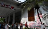 Polresta Bogor Kota bersama warga membersihkan dan mengecat ulang dinding Balaikota Bogor yang merupakan bangunan cagar budaya yang dilindungi pascaaksi vandalisme oleh mahasiswa GMNI saat unjuk rasa di gedung Balaikota Bogor pada Kamis (21/8/2025).