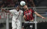 Pemain AC Milan Matteo Gabbia berduel udara dengan pemain Cremonese David Okereke pada laga pertama Seri-A Liga Itali di Stadion San Siro, Milan, Ahad (24/8/2025). Milan takluk dari Cremonese dengan skor 1-2. (FOTO : AP Photo/Luca Bruno)