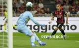 Pemain AC Milan Santiago Gimenez melepaskan tendangan ke gawang Cremonese yang dijaga kiper timnas Indonesia Emil Audero pada laga pertama Seri-A Liga Itali di Stadion San Siro, Milan, Ahad (24/8/2025). Milan takluk dari Cremonese dengan skor 1-2. (FOTO : AP Photo/Luca Bruno)