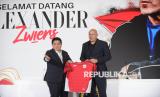 Direktur Teknik PSSI Alexander Zwiers menunjukan Jersey timnas Indonesia saat pengenalan Direktur Teknik baru PSSI di Jakarta, Senin (25/8/2025). (FOTO : Republika/Prayogi)