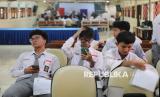 Pelajar menunggu untuk melakukan perekaman KTP Elektronik (E-KTP) saat adanya layanan jemput bola perekaman KTP elektronik (E-KTP) di SMAN 8 Jakarta, Tebet, Jakarta, Selasa (26/8/2025). Suku Dinas Dukcapil Jakarta Selatan menggelar layanan jemput bola perekaman KTP elektronik (E-KTP) dan aktivasi Identitas Kependudukan Digital (IKD) yang bertujuan memudahkan siswa dalam mengurus administrasi kependudukan tanpa harus datang ke kantor Dukcapil. (FOTO : Republika/Prayogi)