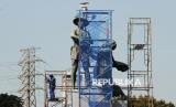 Pekerja melakukan persiapan perawatan atau konservasi Patung Pahlawan atau yang dikenal dengan Tugu Tani di Menteng, Jakarta, Rabu (27/8/2025). Pemprov DKI Jakarta melalui Pusat Konservasi Cagar Budaya Dinas Kebudayaan melakukan konservasi sejumlah patung dan monumen bersejarah yang ada di Jakarta secara bertahap. Konservasi ini dilakukan sebagai langkah merawat dan melestarikan monumen-monumen bersejarah. Tugu Tani atau patung Pahlawan ini diresmikan oleh Presiden Sukarno pada 1963. (FOTO : Republika/Prayogi)