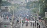 Sejumlah pengunjuk berlarian ketika dibubarkan anggota kepolisian saat aksi 28 Agustus 2025 di Kawasan Pejompongan, Jakarta, Kamis (28/8/2025). Aksi yang digelar untuk mengkritisi kinerja anggota dewan serta pemberian tunjangan perumahan bagi anggota DPR tersebut berakhir ricuh. (FOTO : Republika/Prayogi)