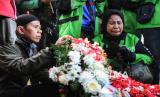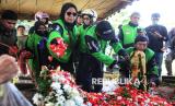Para kerabat menaburkan bunga di makam Affan Kurniawan (21) di TPU Karet Bivak, Jakarta, Jumat (29/8/2025). Affan Kurniawan yang merupakan driver ojek online tersebut meninggal dunia setelah dilindas mobil kendaraan taktis (Rantis) Brimob saat terjadinya bentrok dengan polisi di kawasan Pejompongan, Jakarta. Pemakaman Affan dikawal dan dihadiri oleh ribuan driver ojol. (FOTO : Republika/Prayogi)