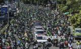 Iring-iringan pengemudi ojek online (ojol) mengantarkan jenazah Affan Kurniawan ke TPU Karet Bivak di Jakarta, Jumat (29/8/2025). Jenazah pengemudi ojol Affan Kurniawan yang meninggal dunia usai terlindas mobil rantis Brimob saat Aksi 28 Agustus 2025 itu dimakamkan di TPU Karet Bivak. (FOTO : ANTARA FOTO/Hafidz Mubarak A)