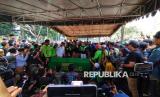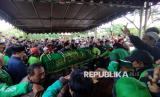 Sejumlah keluarga dan kerabat mengangkat keranda jenazah Affan Kurniawan (21) saat akan dimakamkan di TPU Karet Bivak, Jakarta, Jumat (29/8/2025). Affan Kurniawan yang merupakan driver ojek online tersebut meninggal dunia setelah dilindas mobil kendaraan taktis (Rantis) Brimob saat terjadinya bentrok dengan polisi di kawasan Pejompongan, Jakarta. Pemakaman Affan dikawal dan dihadiri oleh ribuan driver ojol. (FOTO : Republika/Prayogi)