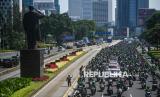 Para pengemudi ojek online (ojol) beriringan mengantarkan ambulans berisi jenazah rekan mereka, Affan Kurniawan menuju pemakaman di Jalan Jenderal Sudirman, Jakarta, Jumat (29/8/2025). Affan Kurniawan yang meninggal akibat terlindas mobil rantis Brimob saat ricuh Aksi 28 Agustus 2025 itu dimakamkan di TPU Karet Bivak, Jakarta Selatan. (FOTO : ANTARA FOTO/Fauzan)