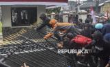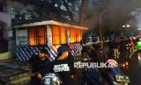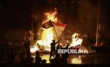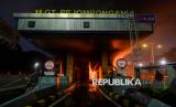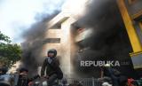 Pendemo membakar Gedung ACC di seberang Mako Brimob, Kwitang, Jumat (29/8/2025). (FOTO : Prayogi/Republika)
