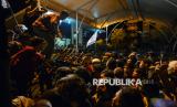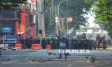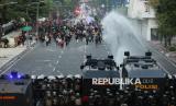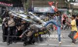 Sejumlah pengunjuk rasa terlibat bentrokan dengan personel Brimob di depan Markas Komando Brimob Polda Metro Jaya, Kwitang, Jakarta, Jumat (29/8/2025). Aksi tersebut menuntut pengusutan kasus penabrakan pengemudi ojek online oleh mobil rantis Brimob. (FOTO : Republika/Prayogi)
