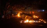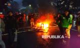 Sejumlah orang membakar pos polisi saat aksi demonstrasi di Gedung DPRD Provinsi Jabar, Jalan Diponegoro, Kota Bandung, Jumat (29/8/2025). Aksi demo yang dilakukan mahasiswa, pelajar dan pengemudi ojek online (ojol) ini sebagai bentuk solidaritas atas meninggalnya Affan Kurniawan, pengemudi ojol yang meninggal dilindas mobil taktis Brimob, serta menyikapi sejumlah kebijakan DPR RI yang dianggap tidak pantas. (FOTO : Edi Yusuf)