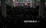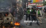 REPUBLIKA.CO.ID, JAKARTA Pengunjuk rasa mengibarkan bendera didekat mobil yang terbakar ketika terjadinya bentrokan antara pengunjuk rasa dengan personel Brimob di depan Markas Komando Brimob Polda Metro Jaya, Kwitang, Jakarta, Jumat (29/8/2025).