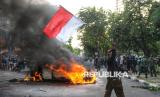 Pengunjuk rasa mengibarkan bendera didekat mobil yang terbakar ketika terjadinya bentrokan antara pengunjuk rasa dengan personel Brimob di depan Markas Komando Brimob Polda Metro Jaya, Kwitang, Jakarta, Jumat (29/8/2025). Aksi tersebut menuntut pengusutan kasus penabrakan pengemudi ojek online oleh mobil rantis Brimob. (FOTO : Republika/Prayogi)