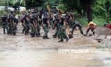 Anggota Marinir TNI AL memindahkan lumpur yang menutupi jalan Teluk Ratai penghubung antara Kabupaten Pesawaran dan kota Bandar Lampung, di Lempasing, Teluk Betung Timur, Bandar Lampung, Lampung, Sabtu (30/8/2025). Curah hujan tinggi pada Jumat (29/8) malam hingga Sabtu (30/8) hingga dini hari mengakibatkan banjir bandang dan longsor yang menutupi jalan penghubung dua daerah tersebut. (FOTO : ANTARA FOTO/Ardiansyah)