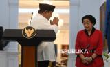 Presiden Prabowo Subianto (kiri) berbincang dengan Ketua Umum PDIP sekaligus Presiden ke-5 RI Megawati Soekarnoputri (kanan) usai menyampaikan keterangan pers di Istana Merdeka, Jakarta, Ahad (31/8/2025). Prabowo menegaskan negara menjamin dan menghormati hak setiap warga dalam mengemukakan pendapat serta meminta aparat TNI dan Polri untuk bersikap tegas dalam menindak massa anarkis yang merusak fasilitas umum, tindakan penjarahan, hingga upaya makar. (FOTO : ANTARA FOTO/Galih Pradipta)