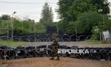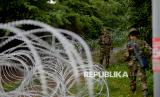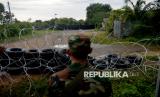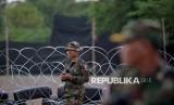 Tentara Kamboja berjaga di kawasan perbatasan Prey Chan, Banteay Meanchey, Kamboja, Jumat (29/8/2025). Sejumlah warga Kamboja di perbatasan Prey Chan masih menanti kejelasan status tempat tinggal mereka akibat konflik perbatasan Kamboja dengan Thailand. Sebelumnya, militer Thailand menutup akses jalan menuju Desa Prey Chan yang membuat warga Kamboja tidak dapat kembali ke rumah mereka. (FOTO : Edwin Putranto/Republika)