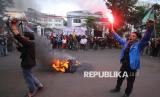 Mahasiswa menyulut foto pejabat di gerbang DPRD Jabar saat aksi demonstrasi mahasiswa dari organisasi mahasiswa yang tergabung dalam Cipayung Plus, Senin (1/9/2025). Dalam aksi demo itu mahasiswa menuntut reformasi Polri, sahkan UU perampasan aset, pembenahan sistem pendidikan, hingga pencopotan Kapolri sebagai bentuk pertanggungjawaban atas kasus pelanggaran HAM. (FOTO : Edi Yusuf)