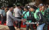 Kapolres Kediri Kota AKBP Anggi Saputra Ibrahim (kiri) bersalaman dengan pengemudi ojek online saat doa bersama untuk perdamaian di depan Gedung Pemkab Kediri, Jawa Timur, Senin (1/9/2025). Doa bersama lintas agama di depan gedung pemkab yang hangus terbakar tersebut diikuti oleh sejumlah tokoh masyarakat, tokoh agama, polisi, TNI, organisasi mahasiswa, pengemudi ojek online, dan masyarakat umum guna memohon kepada Tuhan Yang Maha Esa agar Indonesia khususnya Kediri tetap aman dan damai pasca kerusuhan pada Sabtu (30/8) malam. (FOTO : ANTARA FOTO/Prasetia Fauzani)