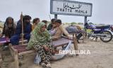Penduduk desa yang menjadi korban banjir menunggu bantuan makanan di Maherian Wala, distrik Jhang, Pakistan, Senin (1/9/2025). (FOTO : AP Photo/K.M. Chaudary)
