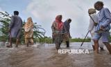 Penduduk desa berjalan melintasi banjir yang merendam wilayah Thatta Mahla, distrik Jhang, Pakistan, Senin (1/9/2025). Warga korban banjir di distrik Multan dan Jhang mengarungi banjir sambil membawa barang-barang mereka ke pinggir jalan dan dataran tinggi. (FOTO : AP Photo/K.M. Chaudary)