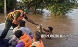 Petugas penyelamat mengevakuasi penduduk desa yang menjadi korban banjir di sungai Thatta Mahla, distrik Jhang, Pakistan, Senin (1/9/2025). (FOTO : AP Photo/Jahan Zeb)