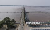 Pengendara sepeda motor melewati Bendungan Trimmu di Sungai Chenab, yang meluap setelah hujan deras di distrik Jhang, Pakistan, Senin (1/9/2025). (FOTO : AP Photo/Jahan Zeb)