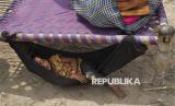 Seorang anak tertidur di tempat pengungsian di stasiun kereta api Thatta Mahla, distrik Jhang, Pakistan, Senin (1/9/2025). (FOTO : AP Photo/K.M. Chaudary)