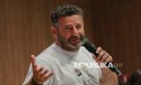 Steering Committee Global Sumud Flotilla Saif Abu Keshek berswafoto usai menyampaikan paparan saat Pelatihan Non-Kekerasan dalam misi kemanusiaan Menembus Blokade Gaza di Gedung General Union of Tunisian Worker, Tunisia, Selasa (2/9/2025). Para relawan dari 44 negara ini termasuk sebanyak sekitar 30 relawan dari Indonesia yang tergabung dalam Indonesia Global Peace Convoy (IGPC) nantinya akan mengikuti pelayaran melalui jalur laut Mediterania dalam rangka mengantar bantuan kemanusiaan bagi warga Gaza. Sebelum berangkat, para relawan diwajibkan mengikuti pelatihan untuk memastikan kesiapan fisik, mental serta teknis dalam menghadapi tantangan selama pelayaran menuju Gaza. (FOTO : Republika/Thoudy Badai)
