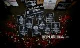 Poster foto korban kekerasan aparat dipajang saat Aksi Kamisan ke-876 di depan Istana Merdeka, Jakarta, Kamis (4/9/2025). Aksi tersebut untuk mengenang 21 tahun pembunuhan aktivis Munir Said Thalib dan meminta Komnas HAM untuk segera menuntaskan penyelidikan pro-yustitia kasus pembunuhan Munir serta meminta Kepolisian RI segera menghentikan tindak kekerasan terhadap warga sipil, setop kriminalisasi terhadap aktivis dan membebaskan semua orang yang ditangkap karena mengekspresikan kritik. (FOTO : Edwin Putranto/Republika)