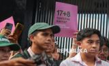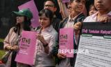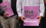Para influencer dan aktivis yang tergabung dalam kelompok Kolektif 17+8 Indonesia Berbenah melakukan aksi simbolis di Gerbang Pancasila, Kompleks Parlemen, Senayan, Jakarta, Kamis (4/9/2025). Dalam aksi tersebut meraka mengirimkan surat resmi kepada DPR RI yang berisi penyampaian 17 tuntutan jangka pendek dan 8 tuntutan jangka panjang melalui jalur resmi DPR RI. Aksi simbolis ini dilakukan untuk menyampaikan 17 tuntutan jangka pendek dan 8 tuntutan jangka panjang yang dinilai mewakili keresahan publik terhadap kondisi ekonomi, sosial, dan politik di Indonesia. (FOTO : Republika/Prayogi)