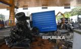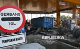 Sebuah truk kontainer mengalami kecelakaan di Gerbang Tol Ciawi 2, Bogor, Jawa Barat, Kamis (4/9/2025). Truk kontainer dengan nomor polisi B-9647-UEL melaju dari arah Ciawi menuju Jakarta tersebut mengalami rem blong pada Kamis (4/9) pukul 02.30 WIB yang mengakibatkan seorang petugas tol mengalami luka ringan dan tiga gardu layanan mengalami kerusakan. (FOTO : ANTARA FOTO/Arif Firmansyah)