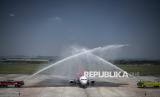 Pesawat jenis Airbus A320 dari maskapai penerbangan AirAsia mendapat penyambutan water salute saat penerbangan perdana rute internasional di Bandara Jenderal Ahmad Yani, Semarang, Jawa Tengah, Jumat (5/9/2025). Bandara Internasional Jenderal Ahmad Yani Semarang resmi membuka kembali penerbangan rute internasional Semarang - Kuala Lumpur melalui maskapai AirAsia yang beroperasi dengan frekuensi penerbangan tujuh kali dalam seminggu menggunakan pesawat jenis Airbus A320. (FOTO : ANTARA FOTO/Aprillio Akbar)
