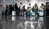 REPUBLIKA.CO.ID, SEMARANG Penumpang tujuan Kuala Lumpur antre menuju pesawat di ruang tunggu keberangkatan internasional Bandara Jenderal Ahmad Yani, Semarang, Jawa Tengah, Jumat (5/9/2025).