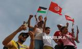 Warga bersama relawan menyambut aktivis kemanusiaan Greta Thunberg, Thiago Avila dan Yasemin Akar saat tiba di Pelabuhan Sidi Bou Said, Tunisia, Ahad (6/9/2025). Kedatangan para aktivis dan relawan dari berbagai negara yang berangkat dari Spanyol disambut antusias oleh para delegasi dan warga Tunisia. Ketiga aktivis bersama ratusan relawan dari 44 negara tersebut akan melakukan pelayaran dari Tunisia menuju Gaza untuk membuka koridor kemanusiaan untuk masyarakat Palestina di Gaza. (FOTO : Republika/Thoudy Badai)