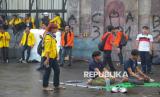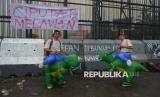 Pengunjung rasa menggunakan kostum dinosaurus saat mengikuti aksi bertajuk Rakyat Tagih Janji di depan Gedung DPR/MPR, Senayan, Jakarta, Selasa (9/9/2025). Aksi tersebut digelar untuk mengawal sekaligus menagih 17+8 tuntutan rakyat yang sebelumnya disuarakan berbagai elemen masyarakat yang telah melewati tenggat waktu pada Jumat (5/9/2025). (FOTO : Republika/Prayogi)